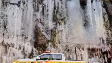 O frio extremo que atinge a região Sul provocou o congelamento de um paredão rochoso na SC-390, em Lauro Müller,…