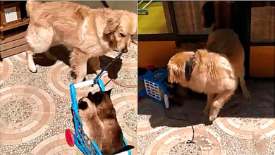 Cachorro brinca de puxar gatos em brinquedo mas acaba capotando carrinho. Veja o vídeo