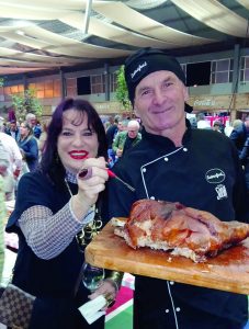 Raquel Cadore e o marido Ricardo Baldo e o mascote Buti num dos 12 brindes do Salão Gastronomico