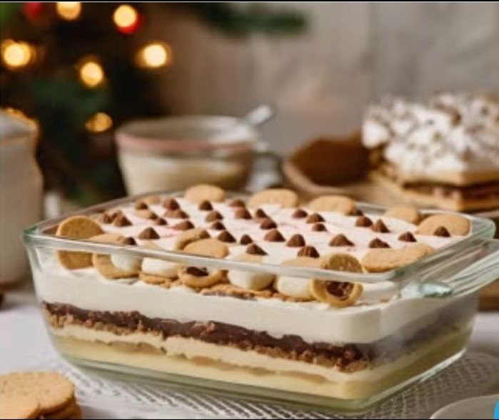 Em um refratário retangular médio, monte camadas de creme e biscoitos umedecidos na mistura de leite e achocolatado.