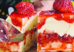 - Em uma forma retangular forrada com plástico filme, disponha uma porção da mistura de cream cheese. Em seguida, coloque a mistura de geleia e morangos no centro e cubra com mais uma porção da mistura de cream cheese.