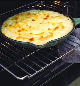 Monte e leve ao forno: Despeje o creme sobre a carne, cubra com fatias de muçarela (ou polvilhe parmesão ralado) e leve ao forno preaquecido a 200 °C por cerca de 15 minutos, até dourar.
