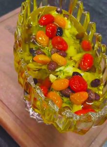 Montagem: Em um recipiente de vidro bem higienizado, disponha em camadas: tomatinhos (sem o alecrim), bacalhau, tomilho, azeitonas e azeite do próprio confit de tomatinhos. Tempere com sal e pimenta-do-reino a gosto ou ajuste apenas no momento de servir. Cubra completamente com o azeite, vede bem com plástico filme e leve à geladeira. O bacalhau deve permanecer totalmente submerso, marinando por 3 dias antes de servir. Sirva com torradinhas ou pão italiano.