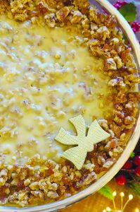 Ingredientes – Cobertura: 2 latas (790 g) de leite condensado; 30 g de manteiga; 300 g de nozes picadas grosseiramente (em pedaços).