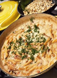 Adicione a massa (penne ou outra de sua preferência) e o bacon. Deixe dourar levemente.