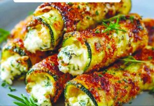 Coloque uma colher do recheio em cada fatia de abobrinha e enrole delicadamente.