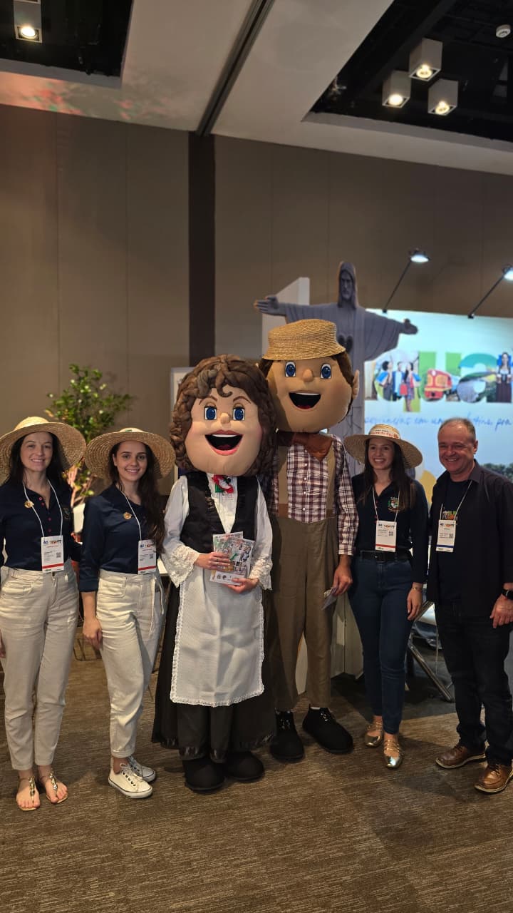 Durante a feira, a divulgação contou com a presença dos personagens Filó e Filomena, símbolos da cultura italiana, que chamaram a atenção do público e reforçaram a identidade do evento.