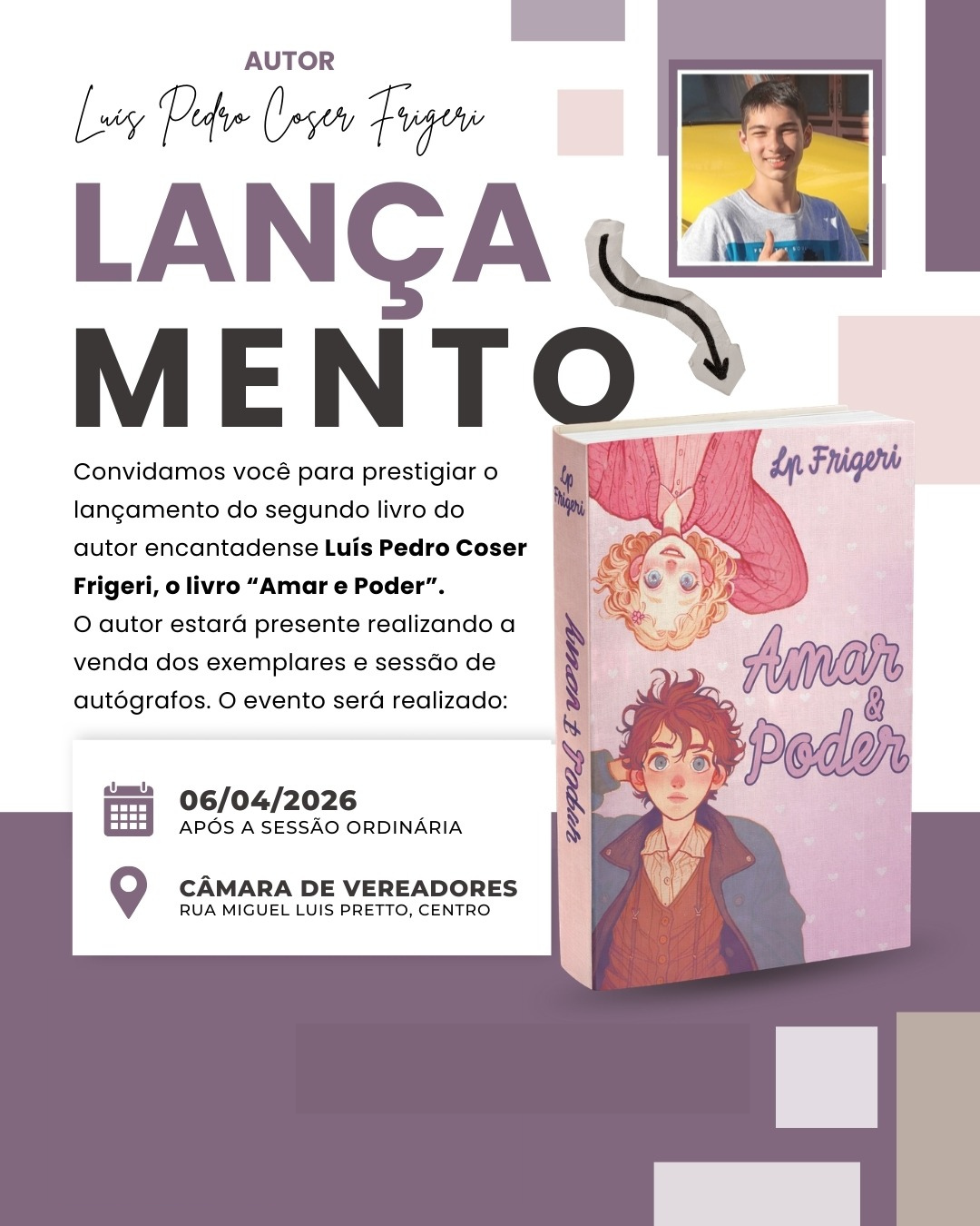 O lançamento marca o segundo trabalho literário do autor de Encantado. O evento ocorre na sede do Legislativo, localizada na Rua Miguel Luís Pretto, no Centro, e é aberto ao público.
