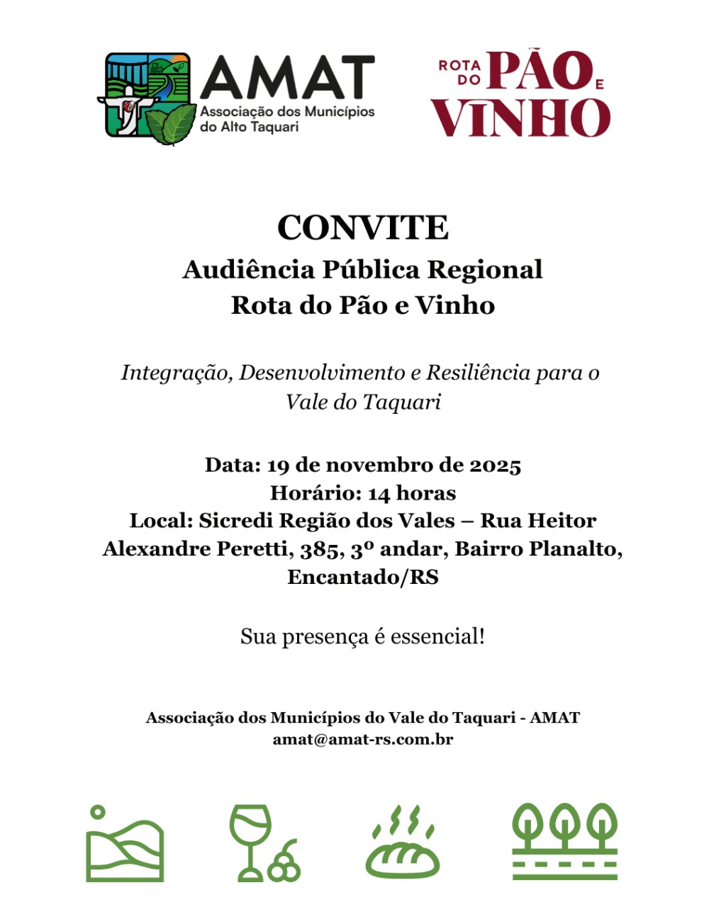 A Associação dos Municípios do Alto Taquari (AMAT) realizará no dia 19 de novembro, às 14h, uma Audiência Pública Regional para tratar da defesa da Rota do Pão e Vinho e da priorização de recursos do FUNRIGS — Fundo do Plano Rio Grande, considerado essencial para viabilizar o projeto.