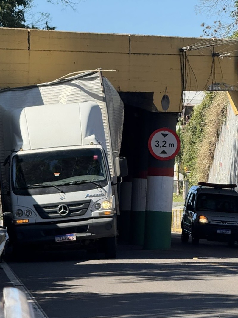 Um caminhão ficou entalado no viaduto Ampère Giordani, no centro de Encantado, na tarde desta quinta-feira (31). O incidente ocorreu por volta das 13h, bloqueando parcialmente o trânsito e gerando lentidão no local.