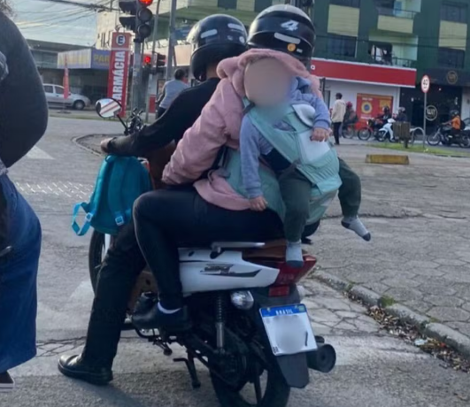 Um casal foi flagrado transportando um bebê sem capacete na garupa de uma moto em Itajaí (SC), com a criança presa em uma bolsa tipo canguru nas costas da passageira. O ato, registrado em vídeo e compartilhado nas redes, descumpre o Código de Trânsito Brasileiro e gerou indignação pública.