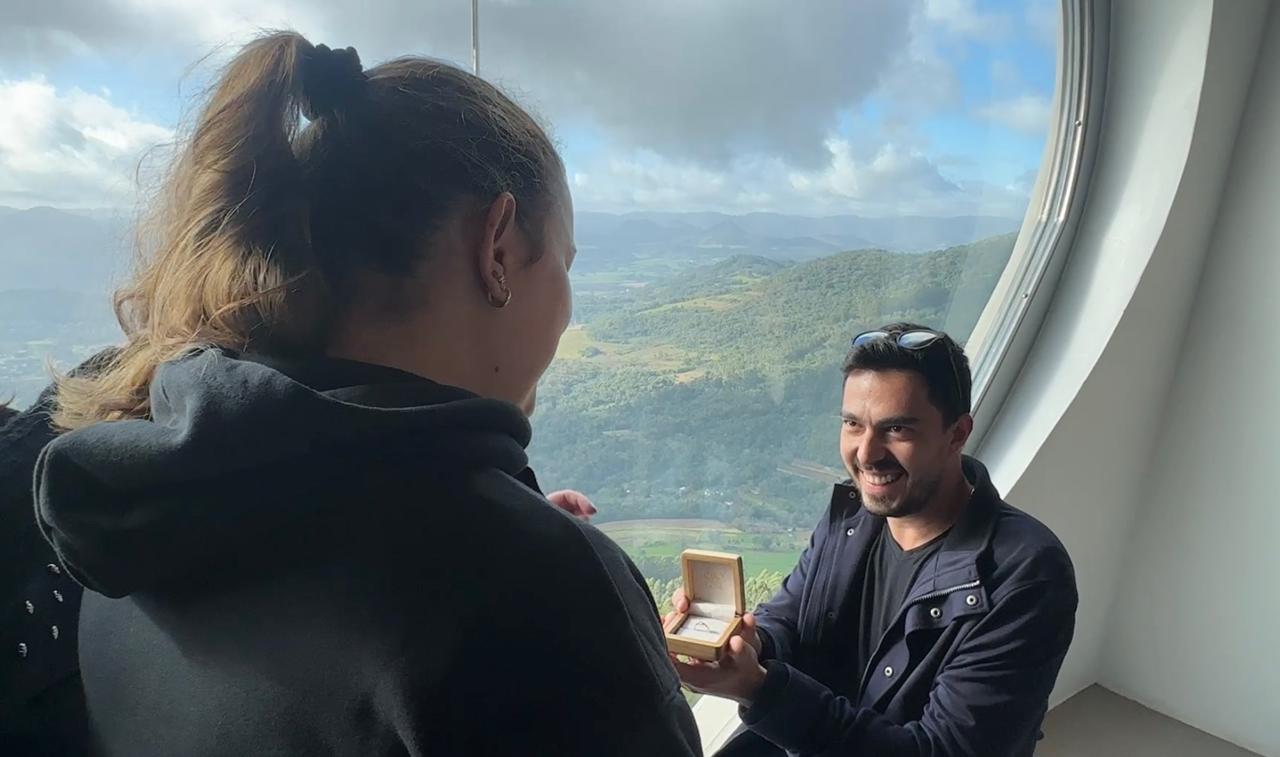Ao chegar ao mirante, batizado de “Coração do Cristo”, o casal tirava fotos diante da vista panorâmica de Encantado e do Vale do Taquari, quando Abílio surpreendeu a todos ajoelhando-se e fazendo o pedido de casamento. O “sim” de Taís foi imediato e emocionou os visitantes e membros da equipe do Cristo que presenciaram o momento.