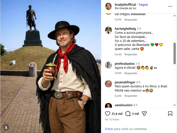A maior página de fãs do ator Brad Pitt no Instagram, com mais de 3,7 milhões de seguidores, repercutiu neste sábado (17) o episódio envolvendo uma moradora de São Valentim, no Norte do Rio Grande do Sul. A conta publicou uma montagem do ator em trajes típicos gaúchos, segurando um chimarrão diante da Estátua do Laçador, em Porto Alegre.