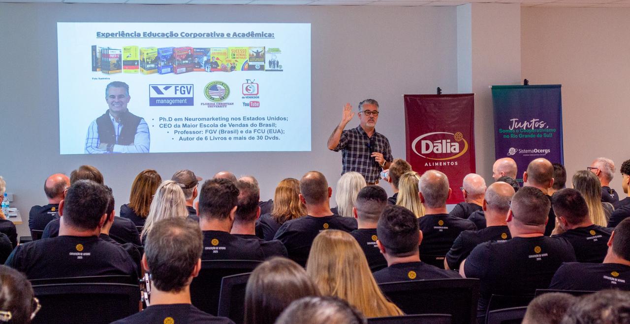 A terceira edição da Convenção Comercial da Cooperativa Dália Alimentos reuniu 150 representantes na manhã de 6 de dezembro, em Encantado. O encontro ocorreu na Sala de Treinamentos do Sicredi Região dos Vales e contou com apoio do Sistema Ocergs/Sescoop. O evento já se consolidou como um dos principais momentos de integração da equipe de vendas da Dália no Rio Grande do Sul.