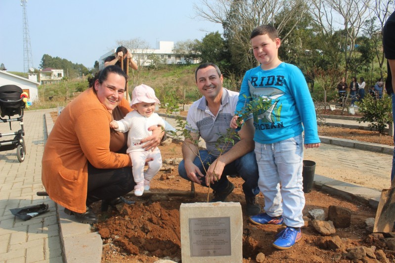 Cada muda recebe uma placa com o nome da criança, dos pais e da espécie da árvore.