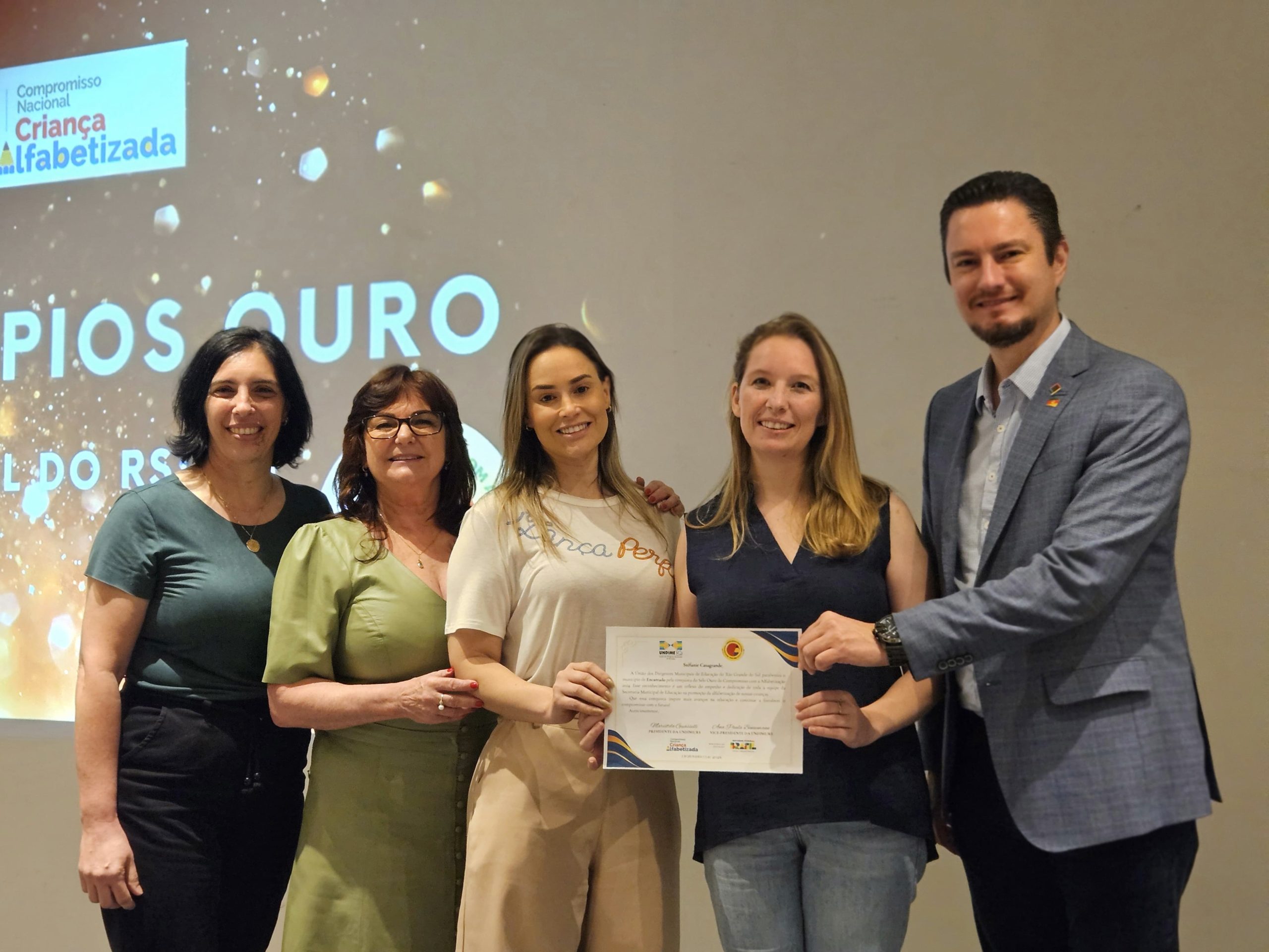 Nesta quarta-feira (18), o Município recebeu do Ministério da Educação Selo Ouro no Compromisso Nacional Criança Alfabetizada (CNCA). O evento de entrega da premiação ocorreu em Porto Alegre, no Hotel Plaza São Rafael. Receberam o certificado, a secretária de Educação do Município, Stéfanie Casagrande; a coordenadora pedagógica, Arilene Telocken; e a Articuladora do Programa Alfabetiza Tchê, Nilviane Rosolen Deconto.