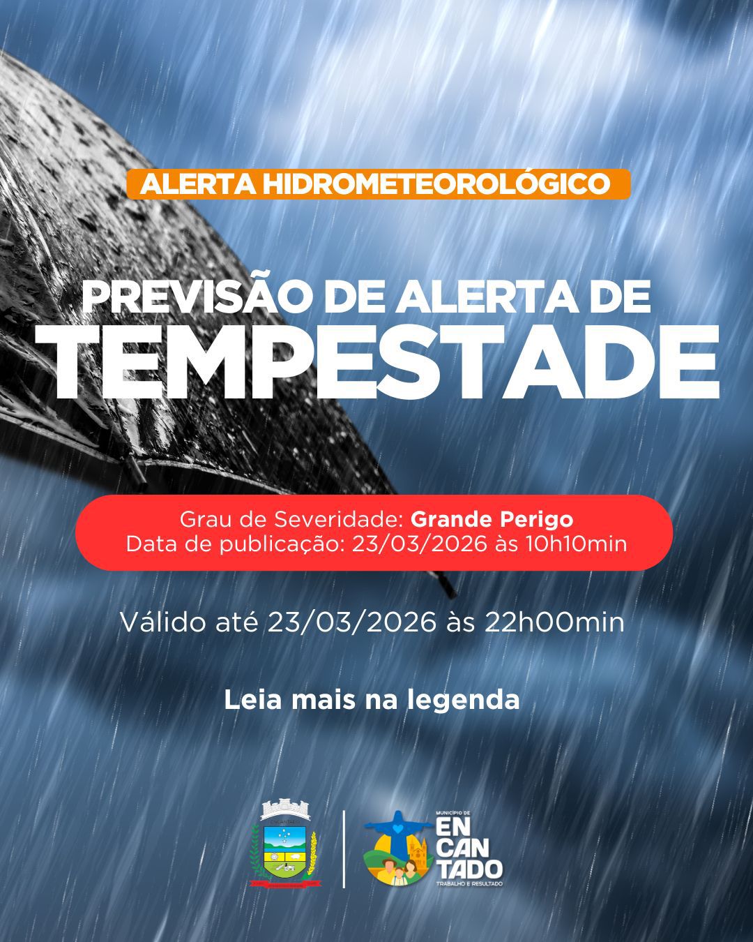 Encantado está sob alerta vermelho para tempestade severa nesta segunda-feira, 23 de março, conforme comunicado da Defesa Civil com base em aviso do Inmet. O alerta começou às 9h10 e segue até as 22h, com risco de chuva intensa, vento forte e granizo.