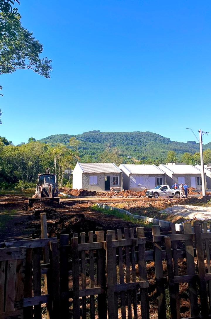 As casas fazem parte do programa “A Casa É Sua – Calamidade” e serão destinadas a famílias atingidas pelas enchentes de 2023 e 2024 em Encantado. Segundo a Prefeitura, as 35 unidades têm 44 m² cada e estão com aproximadamente 70% das obras concluídas.