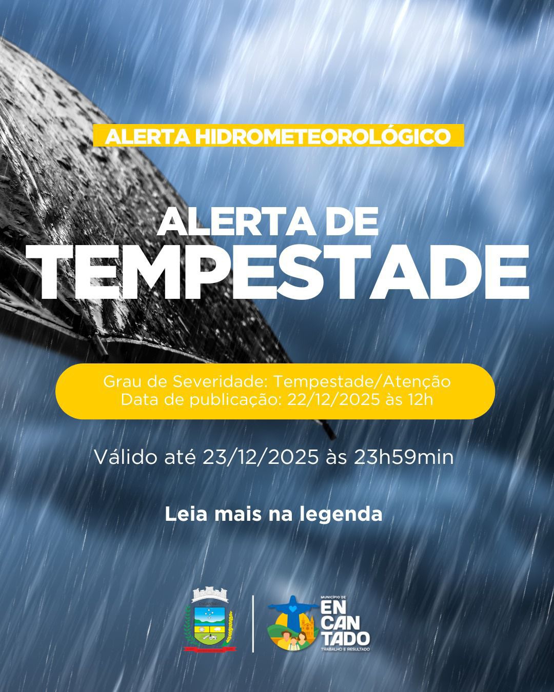 A Defesa Civil de Encantado emitiu alerta preventivo de atenção para o período entre 22 e 23 de dezembro, com previsão de chuvas entre 30 e 100 milímetros. O objetivo é reforçar cuidados em áreas que já registraram deslizamentos ou enxurradas em outros episódios.