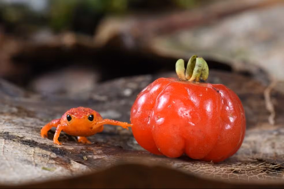 Ensaio fotográfico mostra sapo-pitanga ao lado da fruta que inspira seu nome