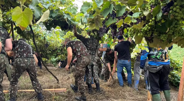 Exército e voluntários fazem mutirão para reerguer parreirais após temporais na Serra