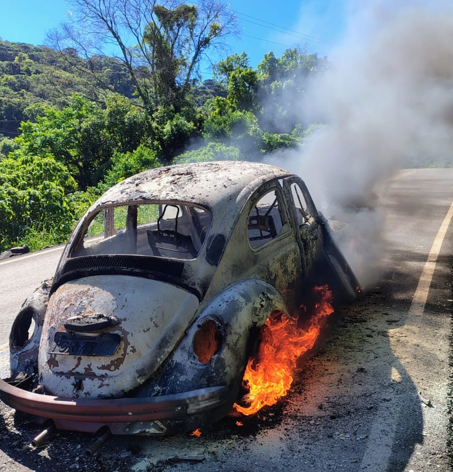 Um Volkswagen Fusca foi completamente consumido pelo fogo na tarde desta terça-feira (14), na localidade de Linha Rechts, interior de Imigrante. O motorista conseguiu sair a tempo, e ninguém ficou ferido.