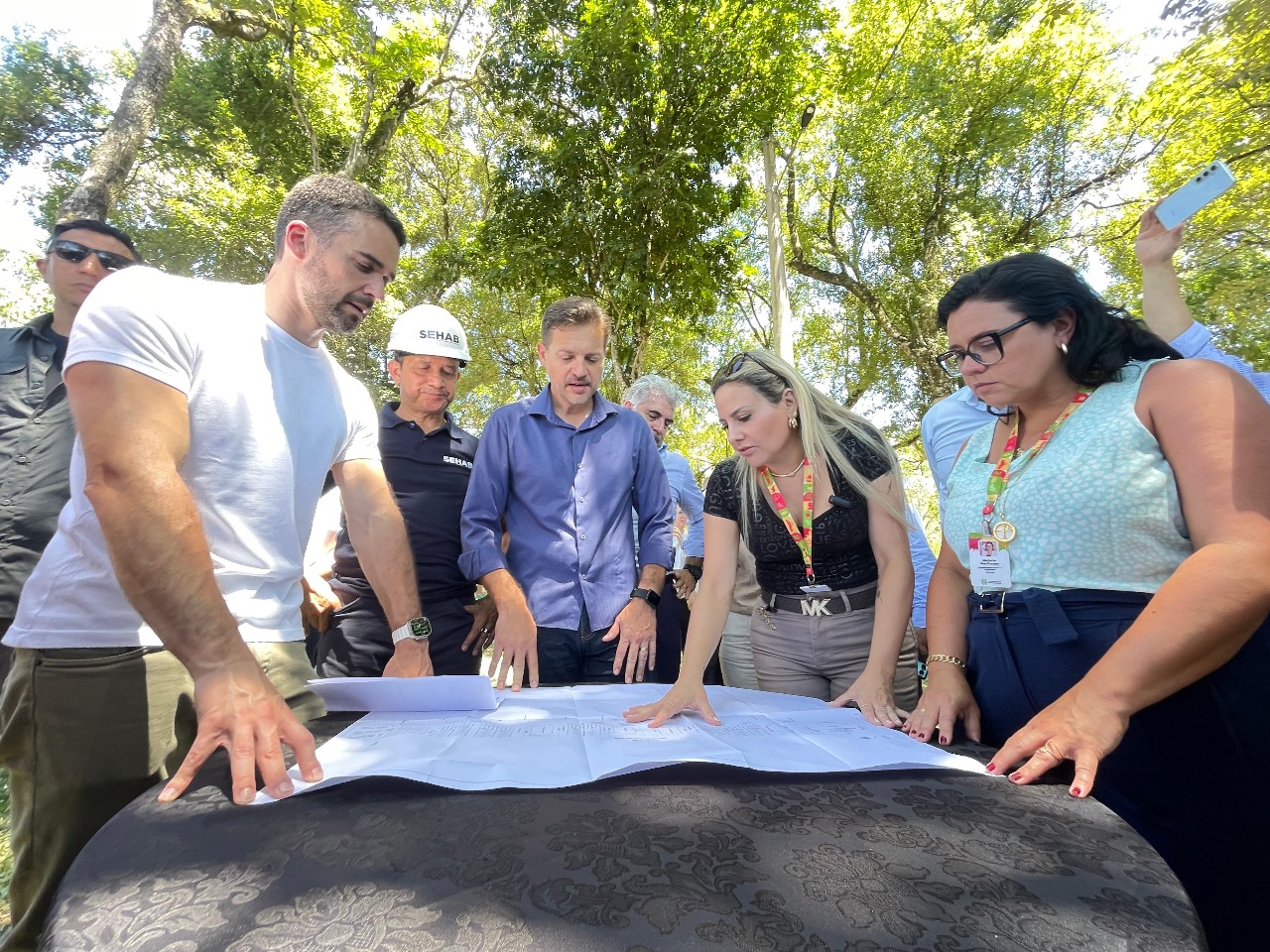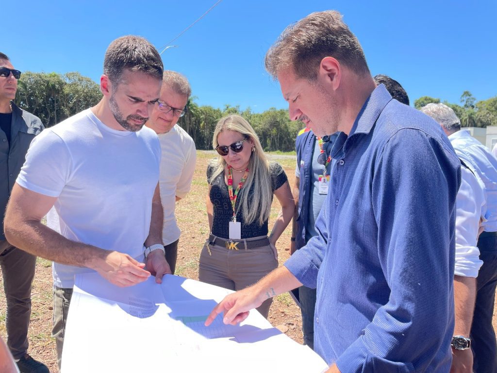 Na manhã desta quarta-feira (05), o governador Eduardo Leite esteve em Encantado para visitar os locais onde serão erguidas 100 moradias definitivas destinadas às famílias desabrigadas pela enchente. Ele esteve acompanhado do secretário da Habitação, Carlos Gomes, do prefeito Jonas Calvi, da empresa responsável pela obra e outras autoridades.