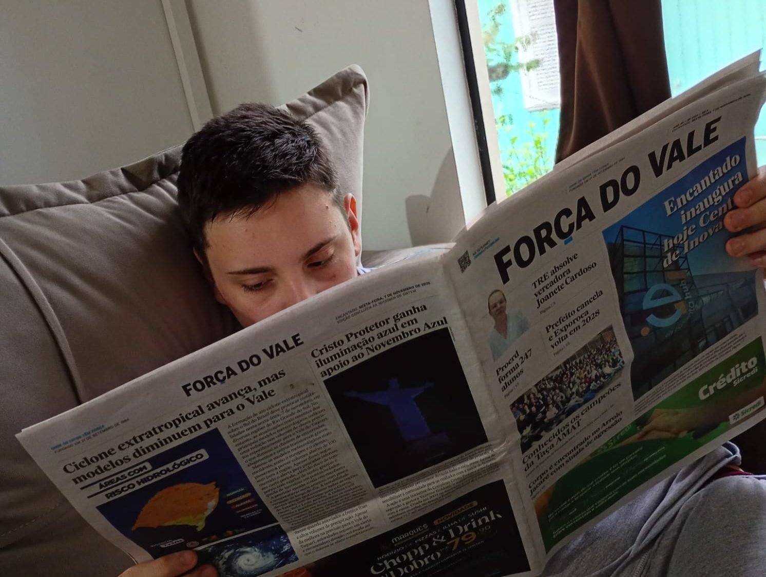 Aos 16 anos, Josué Pedrotti, morador de Roca Sales, tem um hábito diferente da maioria dos jovens da sua idade: ele adora ler jornais impressos. Diagnosticado com autismo de grau 1, o adolescente desenvolveu um grande interesse pelas páginas do Jornal Força do Vale, especialmente pela Arena FV, seção de esportes, e pela previsão do tempo, que ele acompanha com atenção. Às vezes, também folheia a Receitaria da Jacque, mas o que mais chama sua atenção são as notícias esportivas e, ocasionalmente, as matérias policiais. “Ele vai direto pros esportes, depois vê o tempo e às vezes comenta sobre alguma notícia de acidente ou coisa assim”, conta a mãe, Vanderléia de Oliveira, manicure de 37 anos.