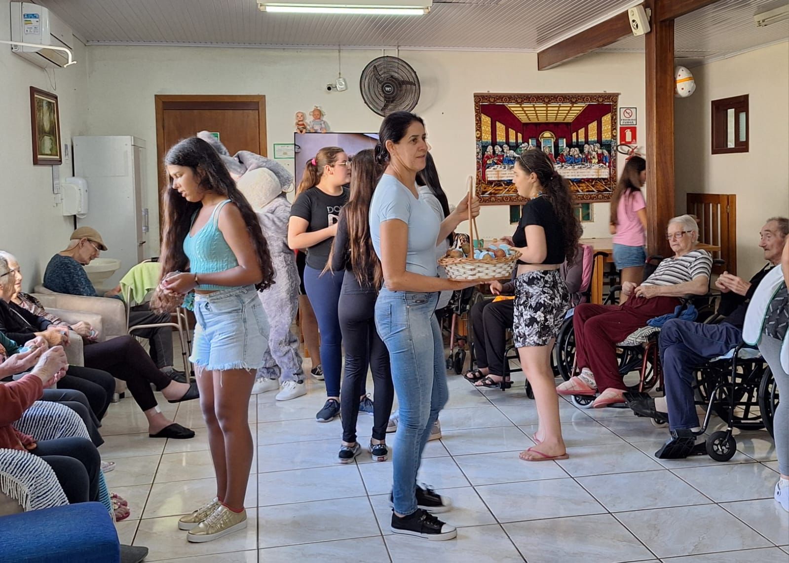 Acompanhadas pela professora de artesanato Luisa Lucca Rosolen, pela psicóloga Lara Oliveira, pela coordenadora Lair Zimmer e pela colaboradora Lisete Piccinini, as jovens participaram de atividades que reforçaram o vínculo com os moradores do lar. Um dos destaques da visita foi a entrega de lembranças de Páscoa, além da presença simbólica do coelhinho, que trouxe leveza ao ambiente.