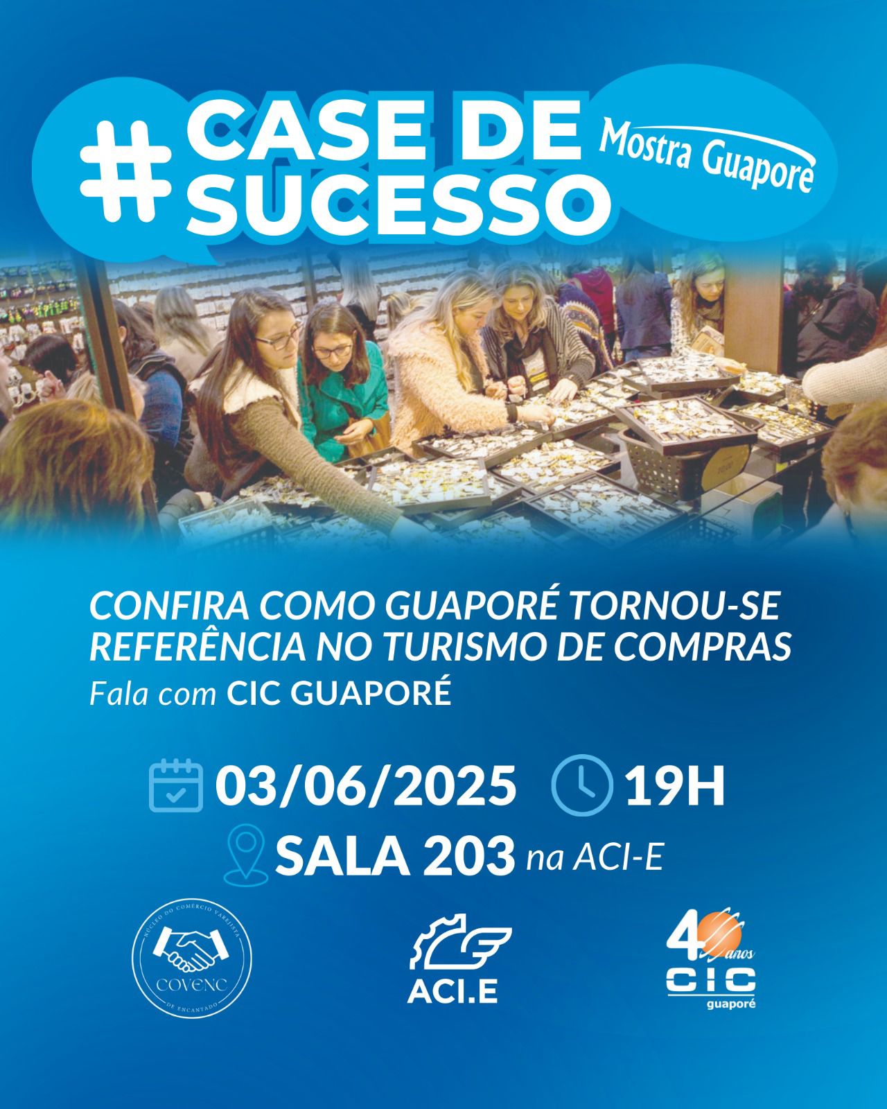 O Núcleo de Comércio Varejista da Associação Comercial e Industrial de Encantado (ACI-E) promove, na próxima terça-feira, dia 3 de junho, um bate-papo com representantes da Câmara de Indústria, Comércio, Agronegócio e Serviços (CIC) de Guaporé sobre o case de sucesso da Mostra Guaporé – evento que transformou a cidade em referência no turismo de compras.