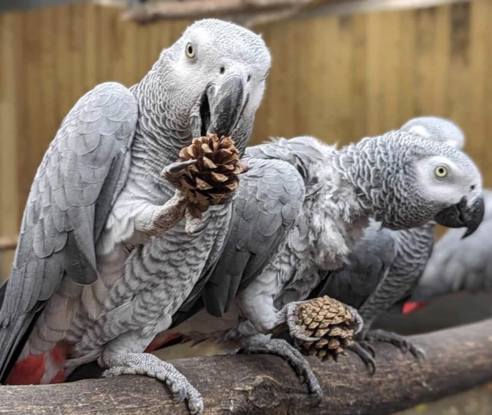 Cinco papagaios cinzentos chamaram atenção no Lincolnshire Wildlife Park, no Reino Unido, após começarem a xingar visitantes e rir das reações. A equipe separou as aves para evitar constrangimentos e reduzir a influência mútua no comportamento.