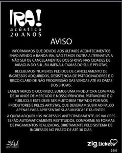 A banda Ira! enfrentou uma série de cancelamentos em sua agenda de shows após uma manifestação política do vocalista Nasi durante uma apresentação em Contagem (MG), no mês passado. Durante o show, o cantor se irritou ao perceber que parte do público vaiava suas declarações contra os envolvidos na invasão aos Três Poderes em 8 de janeiro de 2023. Em resposta, afirmou: