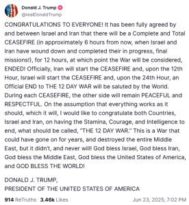 Trump afirmou que, “se tudo correr como deve”, os dois países demonstraram “resistência, coragem e inteligência” ao concordar com o fim da guerra, que ele classificou como “a guerra de 12 dias”.
