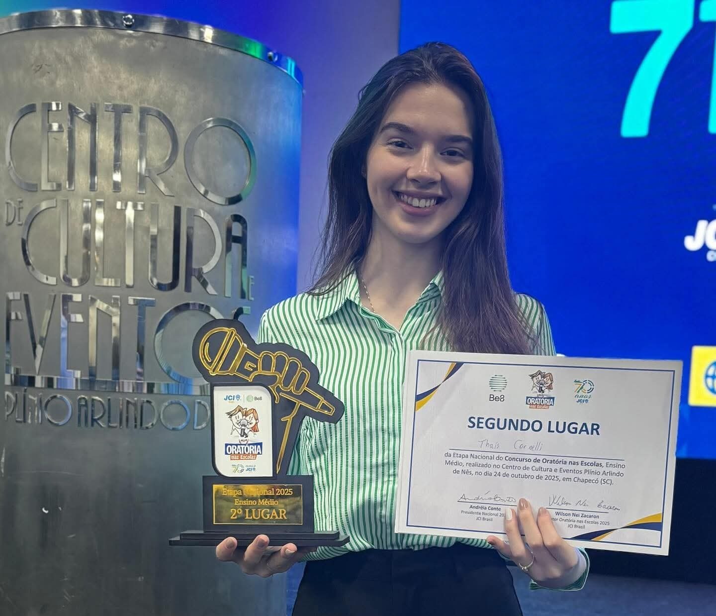 A estudante Thais Cornelli, do 2º ano do Ensino Médio da Escola Estadual Doutor Ricardo, conquistou o 2º lugar na etapa nacional do Concurso de Oratória nas Escolas, promovido pela Júnior Chamber Internacional (JCI). A final foi realizada nesta sexta-feira (24), em Chapecó (SC).