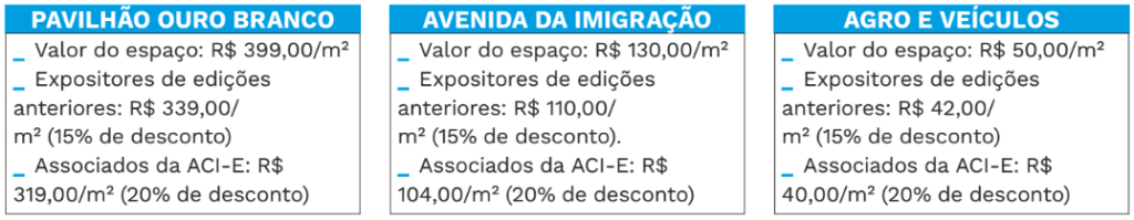 No “Pavilhão Ouro Branco”, os expositores terão à disposição quatro opções de layout, com espaços de 6x6m, 3x3m, 3x5m e 3x6m. As reservas podem ser feitas pelo WhatsApp (51) 9 9958-5039, com Elaine Warken. Nesta edição, a feira oferecerá espaços diferenciados, com valores ajustados conforme a localização e benefícios exclusivos para expositores de edições anteriores e associados da ACI-E.