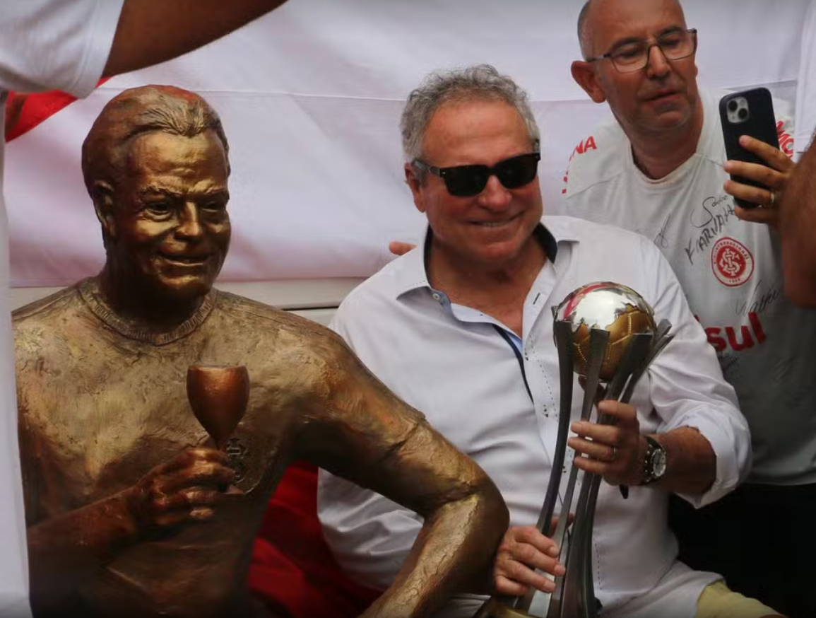 A escultura retrata o ídolo sentado, vestindo a camisa colorada e segurando uma taça de vinho — bebida associada ao ex-treinador. Após o descerramento, ele circulou entre os torcedores para fotos e autógrafos.