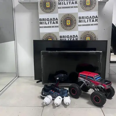 Com o suspeito, os policiais encontraram televisores, um carrinho de controle remoto, um par de tênis e uma bermuda. Todos os itens foram reconhecidos como provenientes de furtos recentes ocorridos no município.