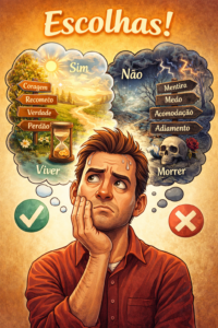 As pessoas vivem e morrem nas suas escolhas! Ninguém atravessa a vida ileso das próprias decisões, nem das que toma, nem das que adia. Eu já vi muita gente atribuir ao destino aquilo que com um pouco de coragem, daria para chamar pelo nome certo: escolha. Gostamos de acreditar que a vida acontece “apesar” de nós, que o tempo resolve, que as pessoas mudam. Escolha é o “sim” que a gente diz com entusiasmo, o “não” que a gente sussurra com culpa, o “depois” que a gente repete até virar “nunca”. É a mensagem que a gente não responde, a conversa que a gente evita para manter uma falsa paz. E é curioso como o preço dessas escolhas não aparece na hora, chega mais tarde, disfarçado de distância, de ressentimento, de um cansaço que não tem sono que cure. Viver é escolher o tempo todo. Não escolher já é uma escolha: a de deixar que alguém escolha por nós, que a vida empurre, que as circunstâncias decidam. Também não se trata de romantizar escolhas, nem toda escolha é livre. Há escolhas feitas sob pressão, sob falta, sob cansaço, sob dor. Há escolhas que acendem a vida, e não é porque são fáceis, são as mais difíceis que nos devolvem o ar: escolher pedir desculpas, escolher encerrar um ciclo, escolher recomeçar, mesmo sem garantias. Escolher dizer a verdade com cuidado, mas com firmeza. Escolher largar o orgulho na porta e entrar inteiro num diálogo. Escolher buscar ajuda. E há escolhas que vão matando aos poucos, uma espécie de anestesia diária. A pessoa continua acordando, trabalhando, sorrindo, mas por dentro vai ficando menor, vai morrendo de não se ouvir, morrendo de se abandonar, morrendo de se acostumar com o que dói. Somos o resultado do que escolhemos nos dias comuns. Talvez viver seja isso: escolher com mais consciência, e talvez morrer seja continuar escolhendo por medo, por hábito, por conveniência. Que tenhamos coragem de escolher pela Vida, pois vivemos e morremos nas nossas escolhas!