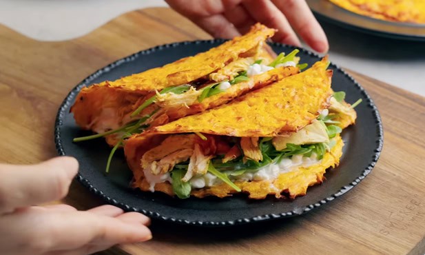 5- Enrole como um wrap, polvilhe um pouco de mussarela por cima e leve novamente ao forno até o queijo derreter.