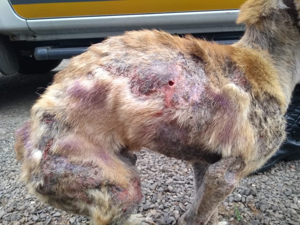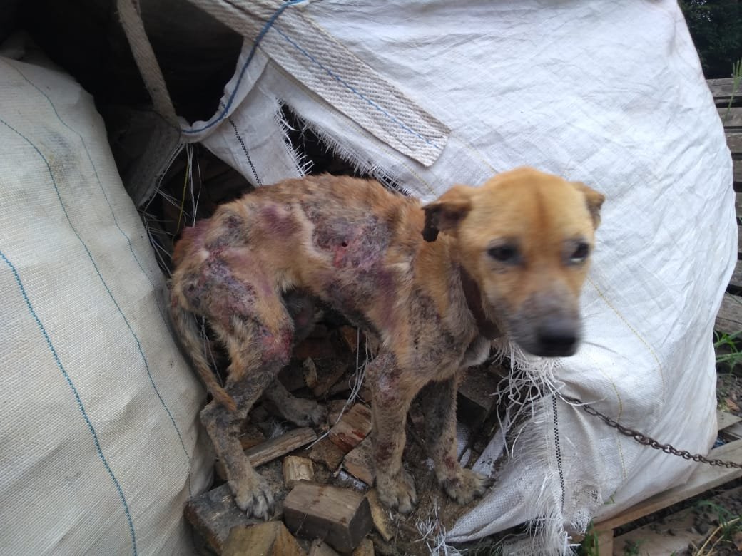 No local, foi encontrato um cachorro em estado deplorável, com vários buracos pelo corpo, com muita miíase e sarna além de estar preso em uma corrente pequena no meio a entulhos.