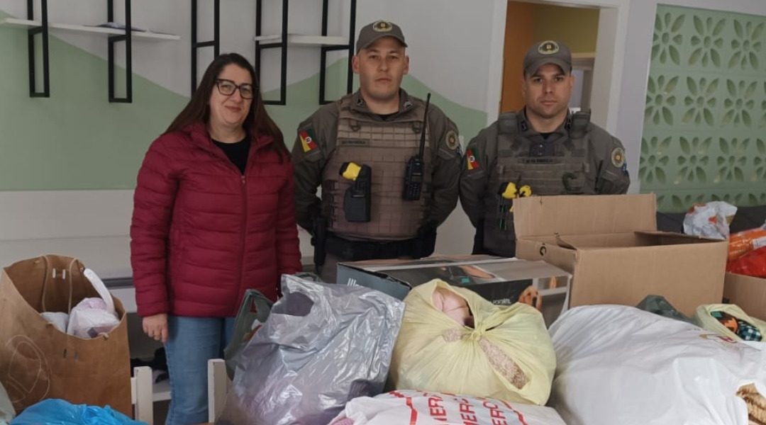 Na manhã desta segunda-feira (25), a Brigada Militar realizou a entrega de doações ao Abrigo de Encantado, em ação solidária desenvolvida com a Escola Estadual de Ensino Médio Vespasiano Corrêa. Os itens foram arrecadados por alunos do Ensino Fundamental da escola, localizada no município de Vespasiano Corrêa.
