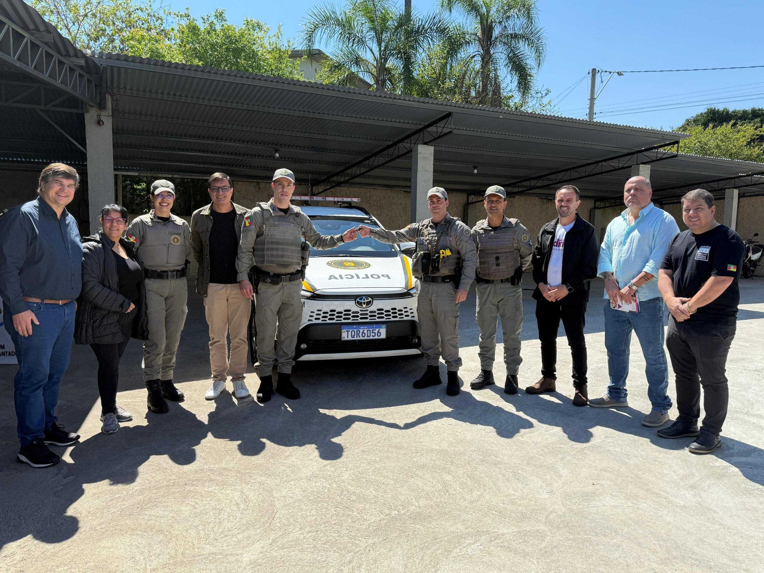 A solenidade de entrega foi realizada na sede da 2ª Companhia da Brigada Militar, em Encantado, com a apresentação de uma nova viatura Corolla Cross 2025, adaptada para uso policial, e da chegada de dez novos soldados.