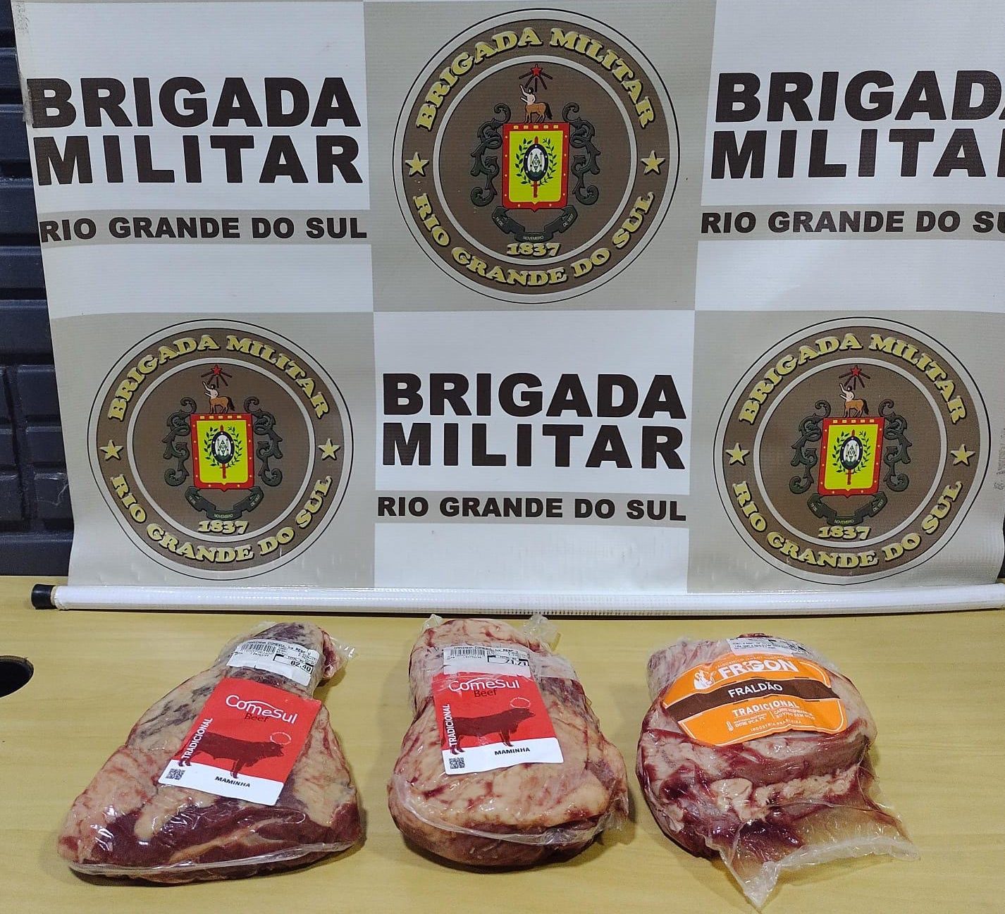 Segundo a Brigada Militar, a guarnição foi acionada por volta das 16h e, após buscas pela região, localizou o suspeito com três pacotes de carne escondidos em sacolas com identificação da rede de supermercados. O prejuízo estimado foi de R$150.