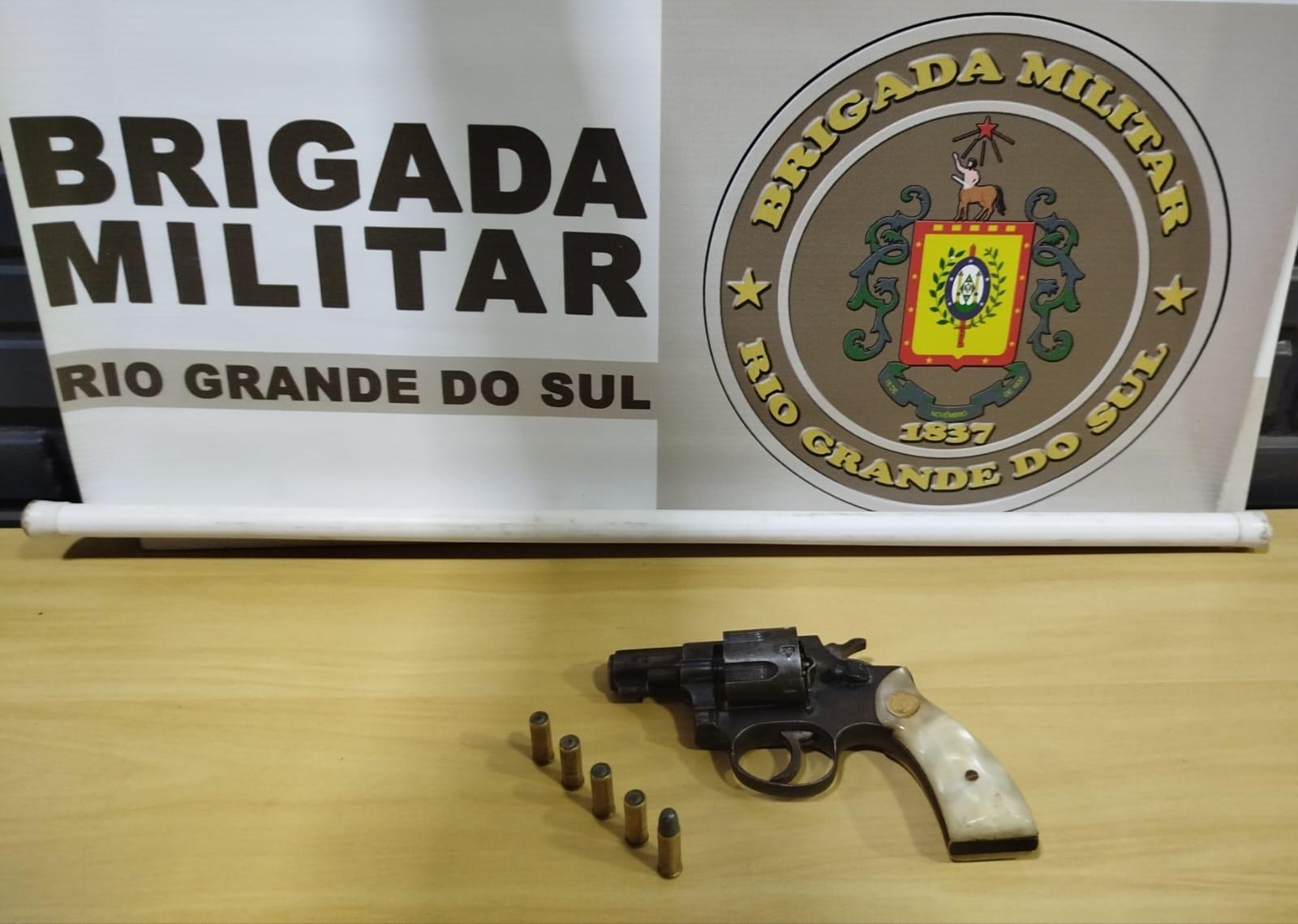 Após buscas, os policiais localizaram o veículo estacionado em um posto. Na revista, foi encontrado um revólver calibre .32 com cinco munições no interior da camioneta.