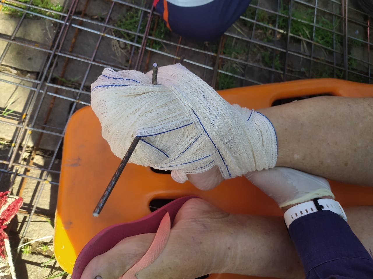 de construção, resultando na transfixação de seu pé direito. O Corpo de Bombeiros Militar de Encantado