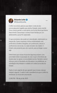 Na publicação feita na rede social X, Leite destacou a gravidade do ocorrido e afirmou que o caso não pode ser minimizado. Ele ordenou prioridade total das forças de segurança na apuração do crime e acionou a Secretaria Estadual da Saúde para oferecer suporte à comunidade afetada.