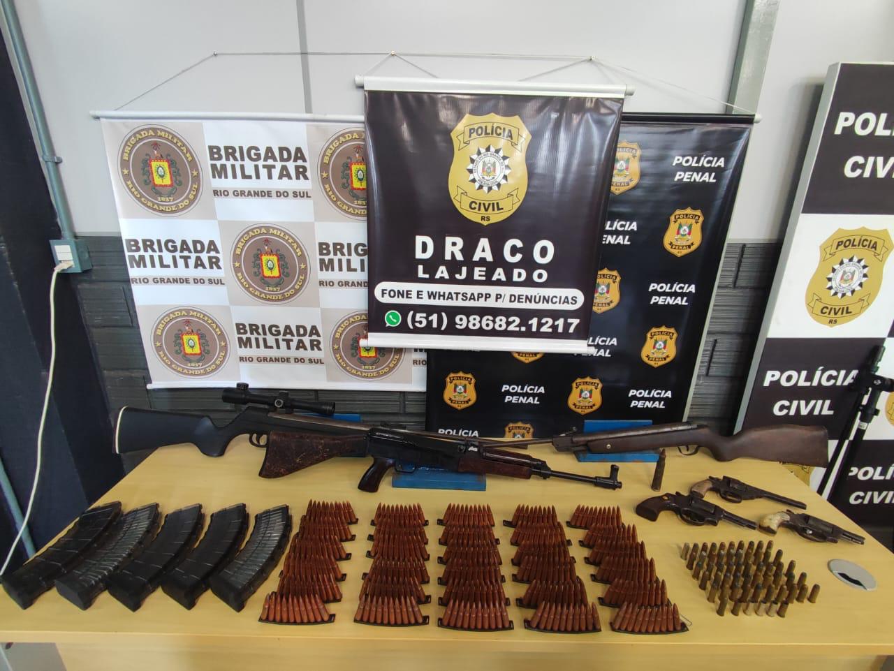 Em uma ação integrada entre a Brigada Militar, a Polícia Civil e a Polícia Penal, um homem de 38 anos foi preso e um arsenal foi apreendido em Lajeado. A operação resultou na retirada de um fuzil VZ 58, três revólveres, duas carabinas de pressão e várias munições. O indivíduo detido foi levado à autoridade policial e permanece à disposição da Justiça.
