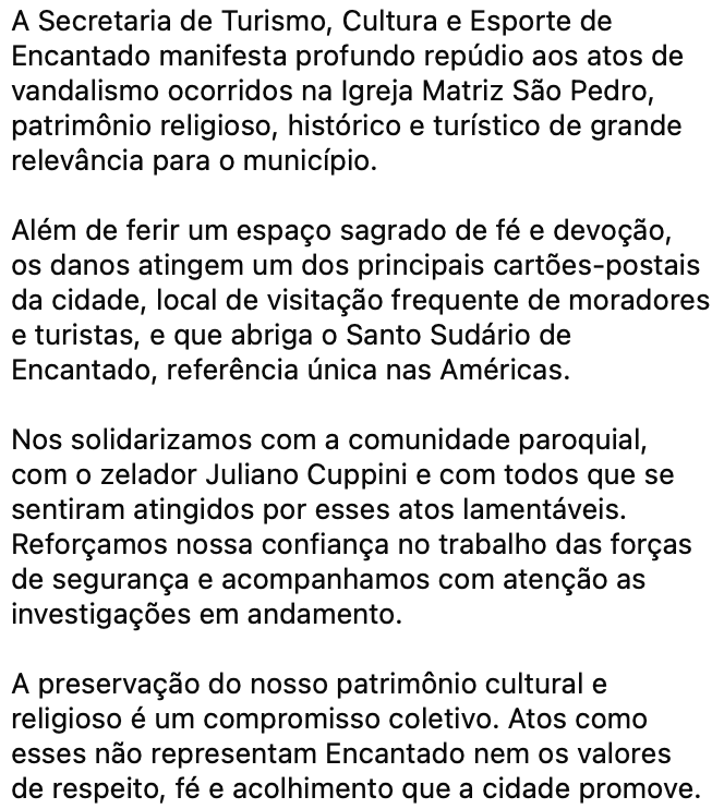 A nota ainda reforça a confiança nas forças de segurança e afirma que os atos “não representam Encantado nem os valores de respeito, fé e acolhimento que a cidade promove”.