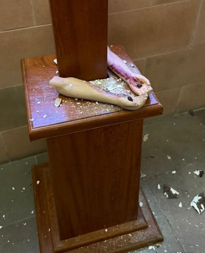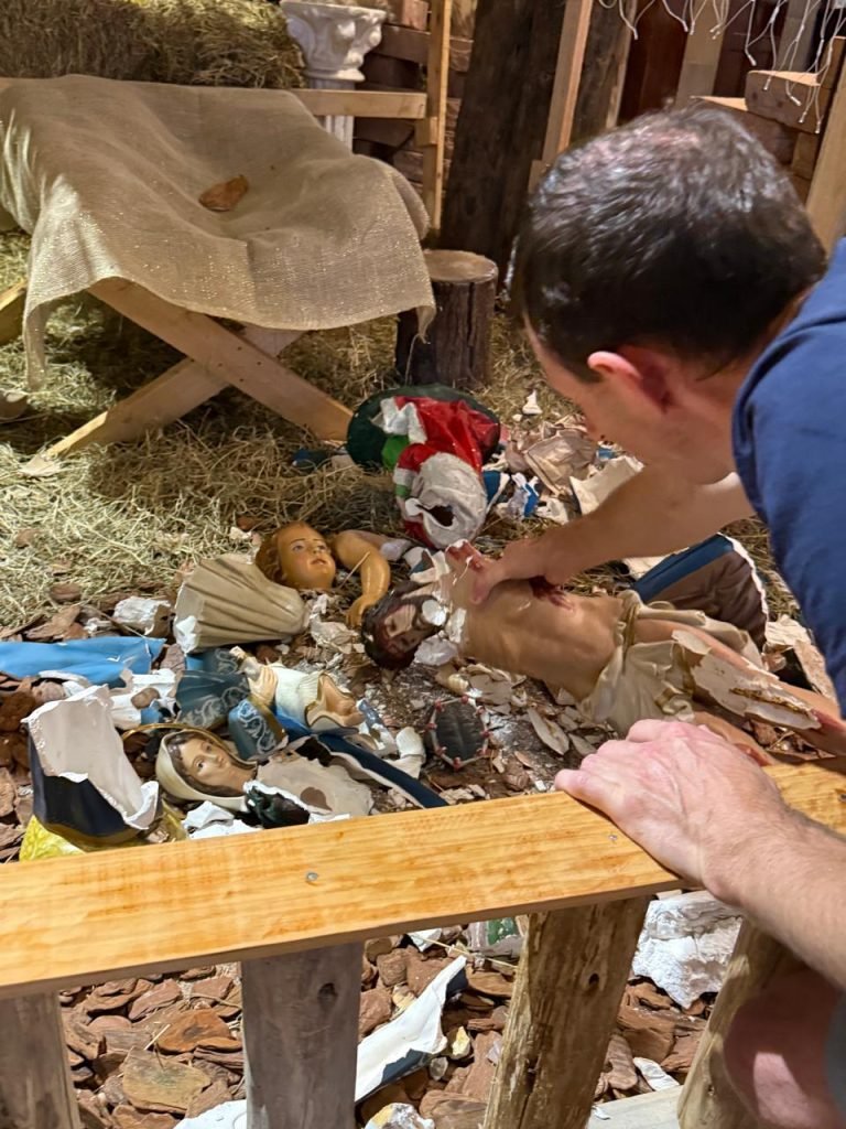 Na manhã de segunda-feira (5), o cenário de destruição aumentou: todo o presépio de Natal foi destruído e a imagem de Cristo na cruz, localizada no espaço do Santo Sudário, foi quebrada.