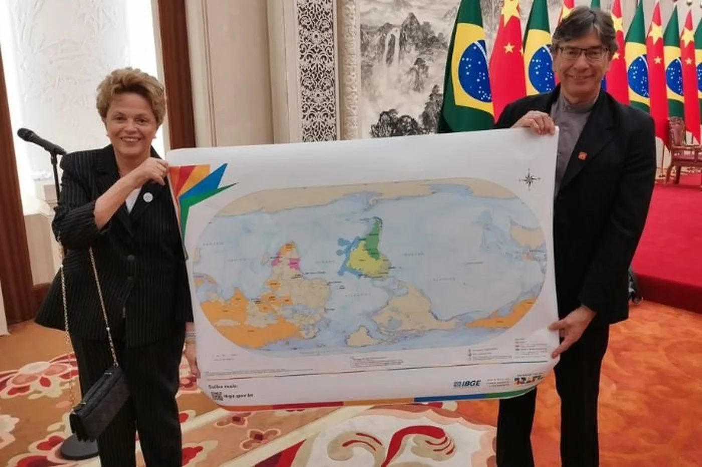 Durante visita oficial à China nesta terça-feira (13), a ex-presidente Dilma Rousseff e o presidente do IBGE (Instituto Brasileiro de Geografia e Estatística), Márcio Pochmann, apresentaram uma versão invertida do mapa-múndi, que posiciona o Brasil no topo e ao centro da imagem.